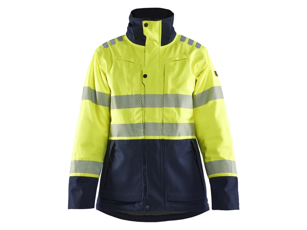 Skvělá ohnivzdorná zimní bunda od firmy Blåkläder v dámském střihu. Ideální volba, pokud pracujete v prostředí s otevřeným ohněm. Tato bunda vás díky hřejivé podšívce, laminovanému materiálu a podlepeným švům ochrání také před chladem, větrem a deštěm. Oděv zcela bez použití kovů s transferovou reflexní páskou a reflexními prvky na ramenou vám zajistí viditelnost ve všech směrech. Navíc je vybaven příjemnou fleecovou podšívkou uvnitř kapes a obousměrným plastovým zipem. Tato bunda odolná vůči olejům, nečistotám a vodě obstojí v každém počasí, takže zvládnete jakoukoli práci. Kapuce 2167 vhodná pro přilbu se prodává samostatně. Bunda je k dispozici rovněž v pánském provedení 4517. Certifikace podle normy IEC 61482-2: APC 2, ELIM 33 cal/cm² a ATPV 39 cal/cm². ČSN EN 1149, ČSN EN ISO 11612, ČSN EN ISO 11611, ČSN EN 13034 a ČSN EN ISO 20471. ČSN EN 343 4/1 – Výška vodního sloupce: 12 000 mm. ČSN EN 342 spolu s modelem 1817 – hodnocení CLO 2.19, Icler 0,326 m² K/W.Dodatočné parametre