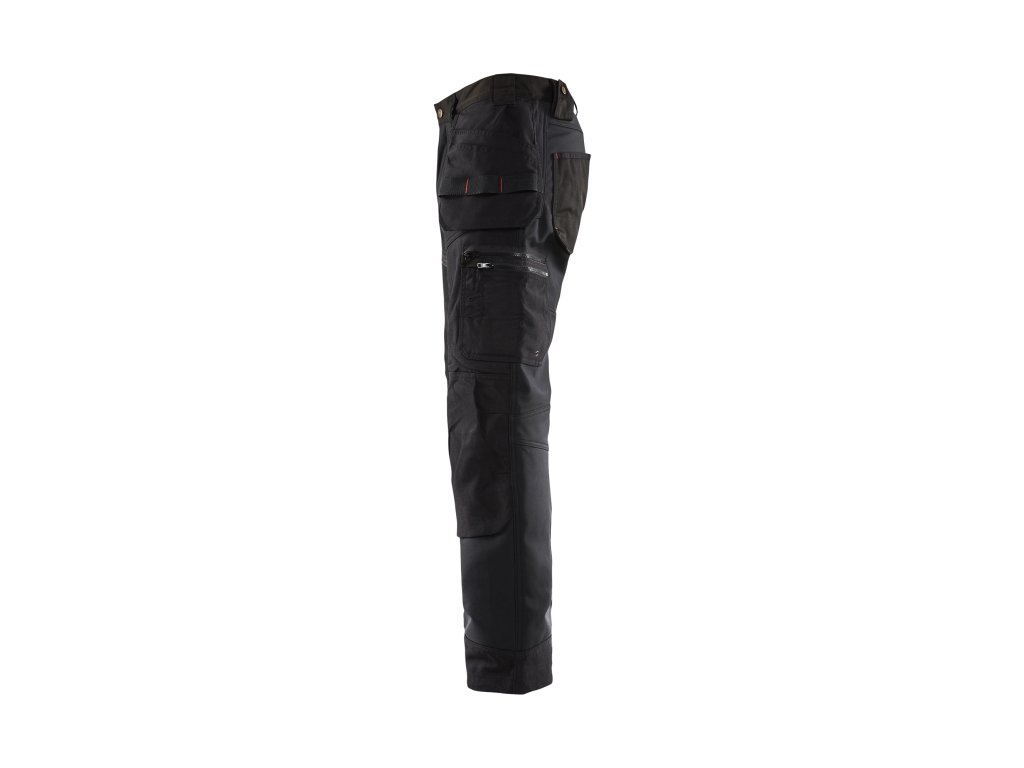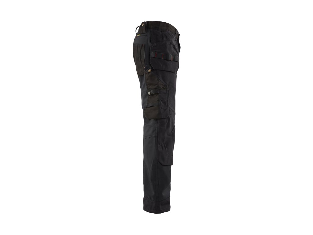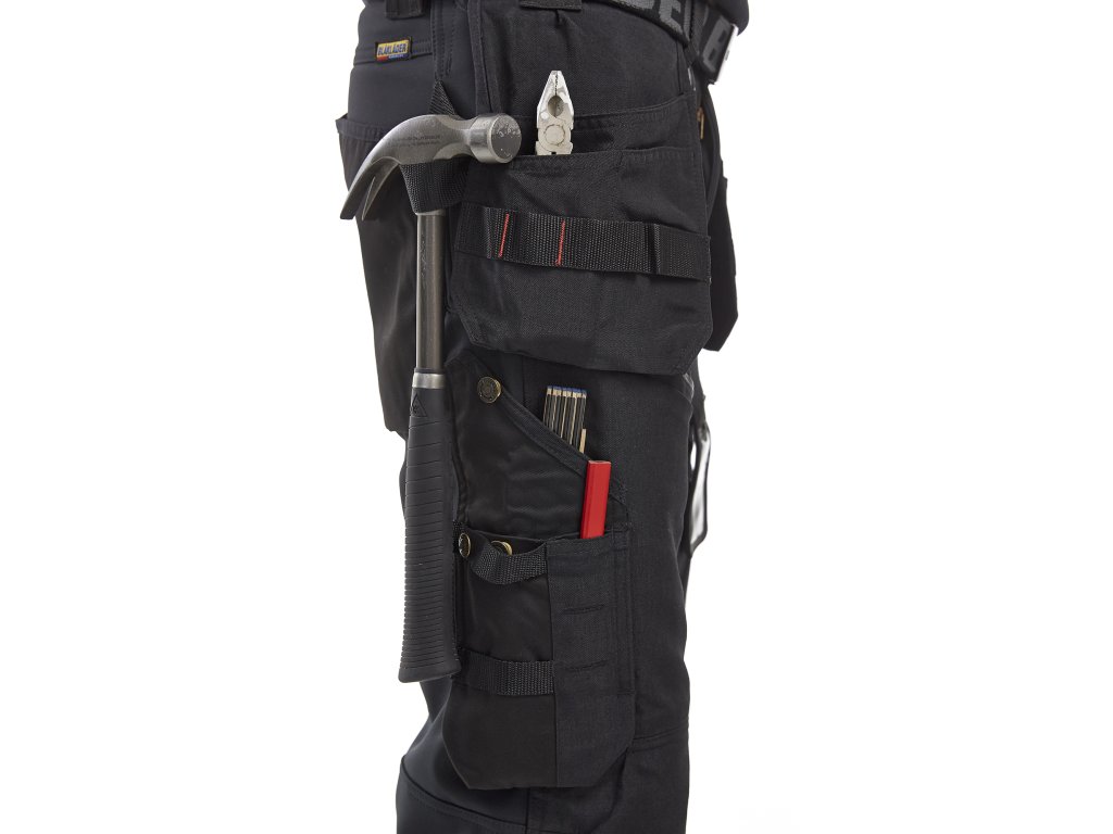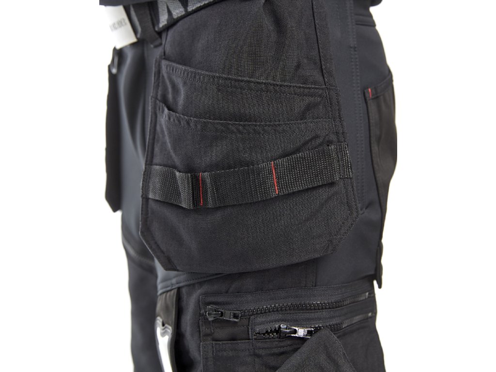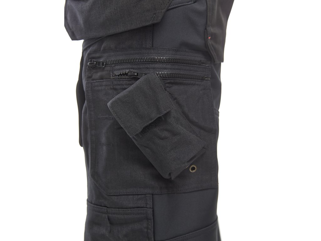 | Zesílení: | Kapsy na hrebíky, zadní kapsy, kapsa na metr, nožní kapsy, stehna, kolena a lem zesílené materiálem CORDURA® |